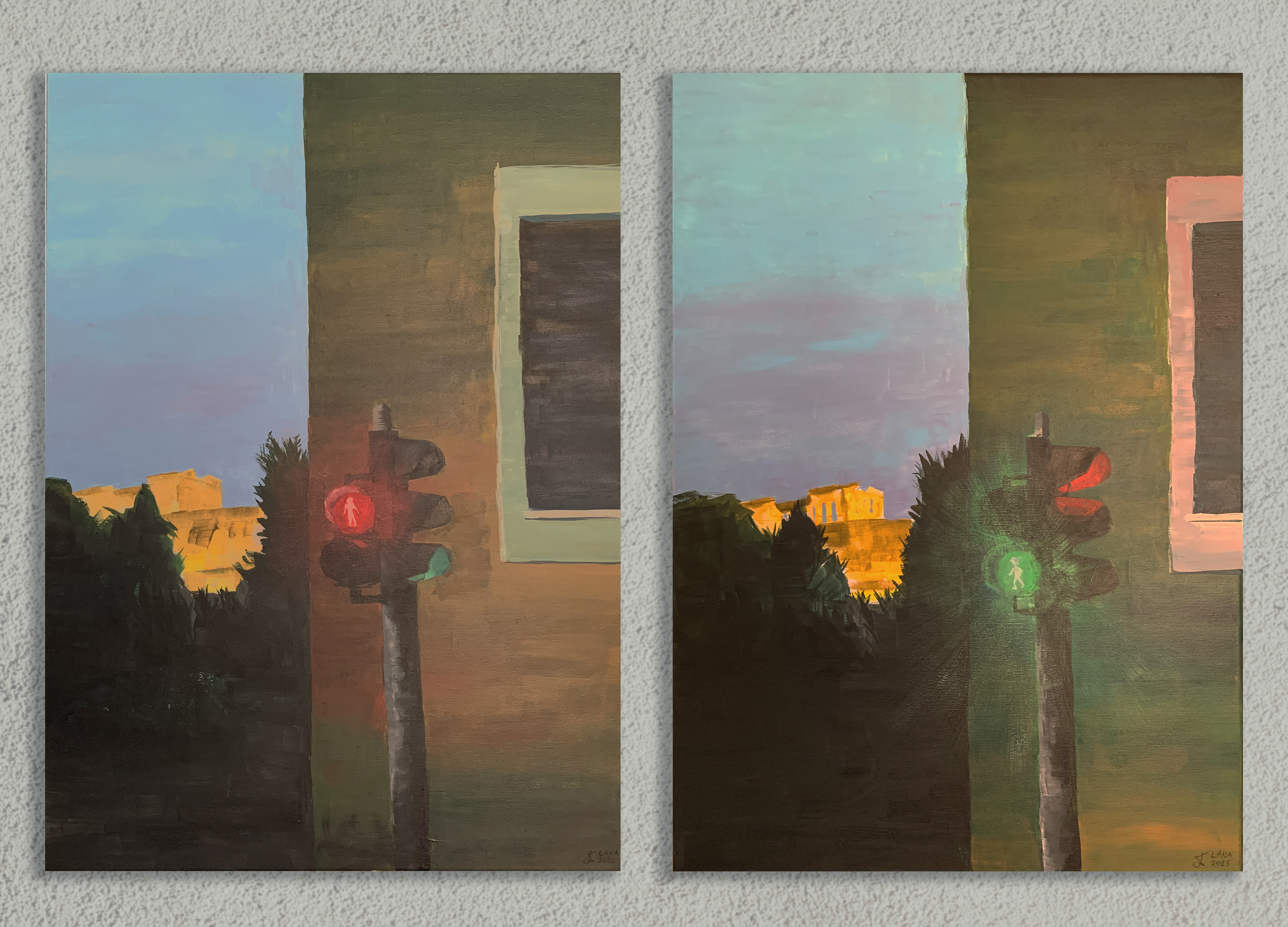 Dyptich "Stuck or moving?", "Red Side", Acrylics on Canvas, 50x70 cm, 2025